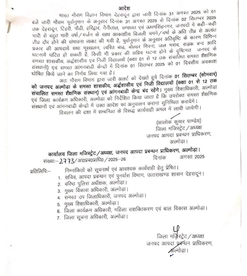 जिस पर कल 01 सितंबर को भारी बारिश के पूर्वानुमान के बाद अल्मोड़ा जिले में कक्षा 1 से 12वीं तक के सभी स्कूल, आंगनबाड़ी केंद्र बंद रखने के निर्देश दिए है। इस संबंध में जिलाधिकारी अल्मोड़ा आलोक कुमार पांडेय तथा जिलाधिकारी नैनीताल वंदना ने आदेश जारी किया है। देखें आदेश