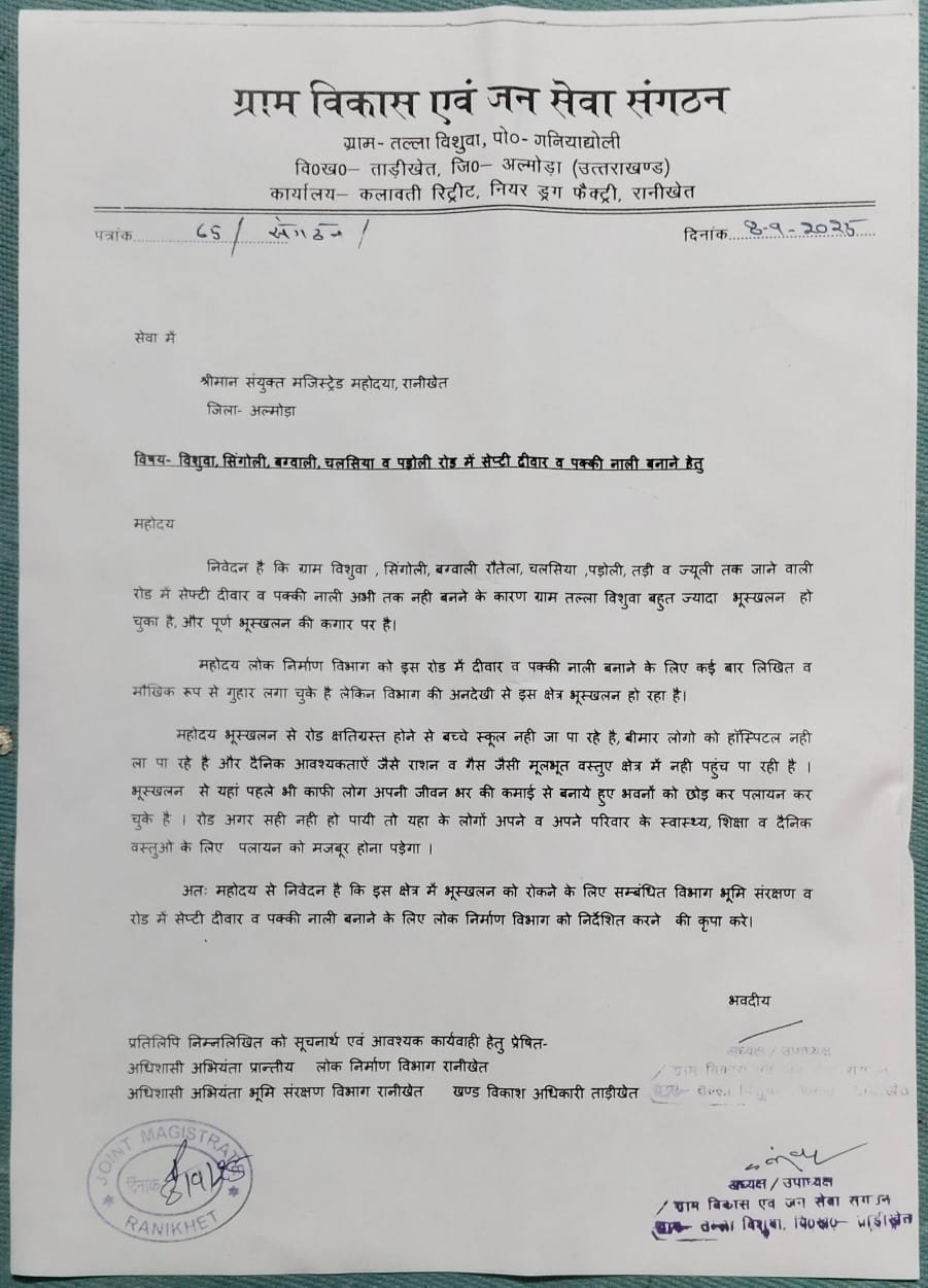 संयुक्त मजिस्ट्रेट को दिए ज्ञापन में लकः गया है कि कि ग्राम विशुवा , सिंगोली, बग्वाली रौतेला, चलसिया ,पड़ोली, तड़ी व ज्यूली तक जाने वाली रोड में सेफ्टी दीवार व पक्की नाली अभी तक नही बनने के कारण ग्राम तल्ला विशुवा बहुत ज्यादा भूस्खलन हो चुका है, और पूर्ण भूस्खलन की कगार पर है। लोक निर्माण विभाग को इस रोड में दीवार व पक्की नाली बनाने के लिए कई बार लिखित व मौखिक रूप से गुहार लगा चुके है लेकिन विभाग की अनदेखी से इस क्षेत्र भूस्खलन हो रहा है।