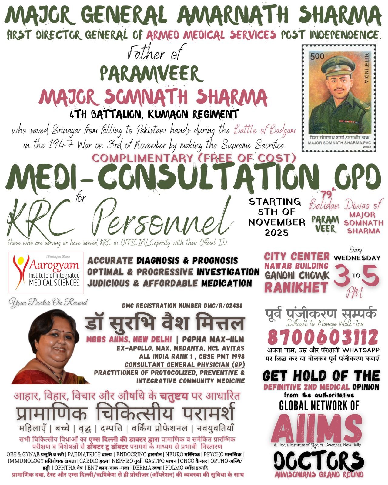 कुमाऊँ रेजिमेंट सेंटर के वीर जवानों को रानीखेत में निःशुल्क चिकित्सीय परामर्श प्रदान करेंगी एम्स की पूर्व डॉक्टर सुरभि, उप कमांडेंट 5 नवंबर को करेंगे शुभारम्भ।