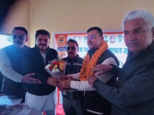 भाजपा रानीखेत के नवनियुक्त मोर्चा जिलाध्यक्षों का फूल मालाओं से विधायक नैनवाल ने किया स्वागत।