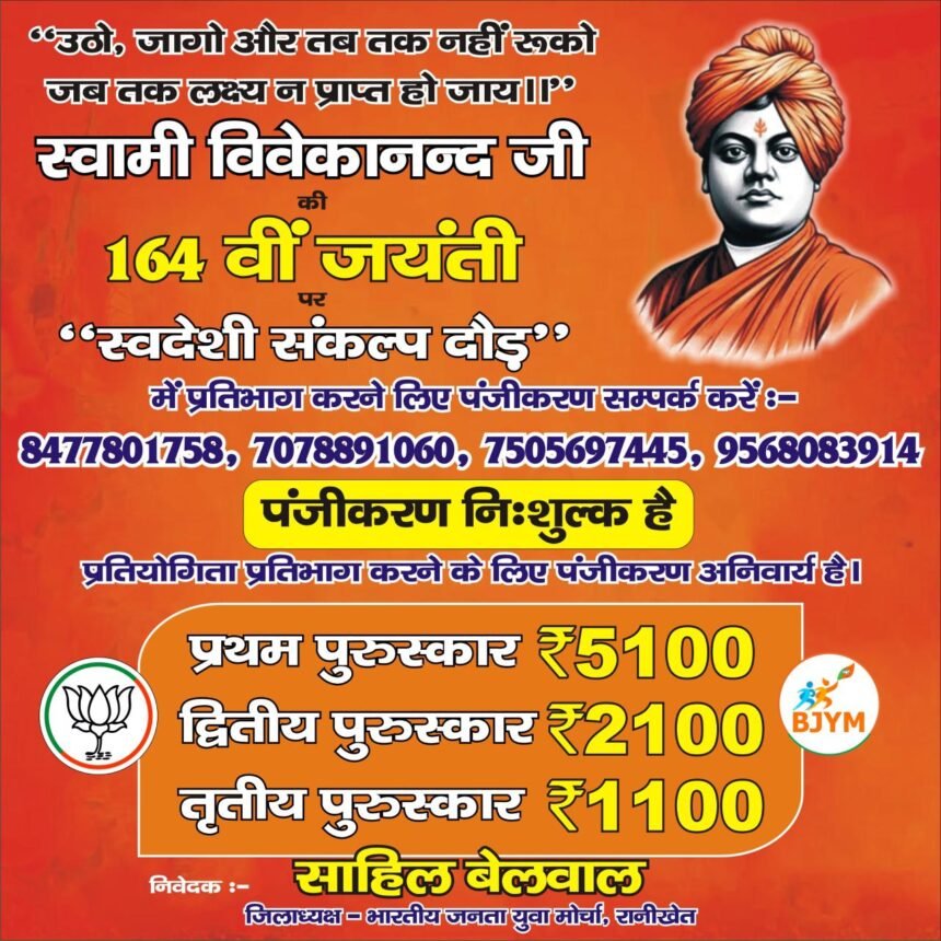 स्वामी विवेकानंद जी की जयंती पर भाजयुमो करेगा मैराथन दौड़ का आयोजन, मिलेगा नकद इनाम।