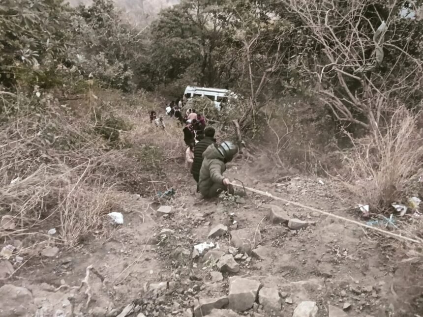भीमताल में टेम्पो ट्रेवलर खाई में गिरा, कई लोग हुए चोटिल, 27 लोग थे सवार, बड़ा हादसा टाला।