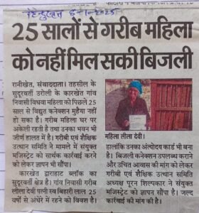 रानीखेत तहसील के मजखाली के निकट उरोली के कारखेत गांव निवासी दलित विधवा महिला लीला देवी पिछले 25 वर्षो से बिना बिजली के अंधेरे में जीवन यापन करने को मजबूर है। गरीब महिला अकेली रहती है और उनका घर भी जीर्ण हालत में है। सोमेश्वर विधानसभा में मंत्री रेखा आर्य के क्षेत्र में पड़ने वाले मजखाली में निवासरत इस महिला को शासन प्रशासन से फ़रियाद लगाने के बाद भी मदद नहीं मिल पा रही है।