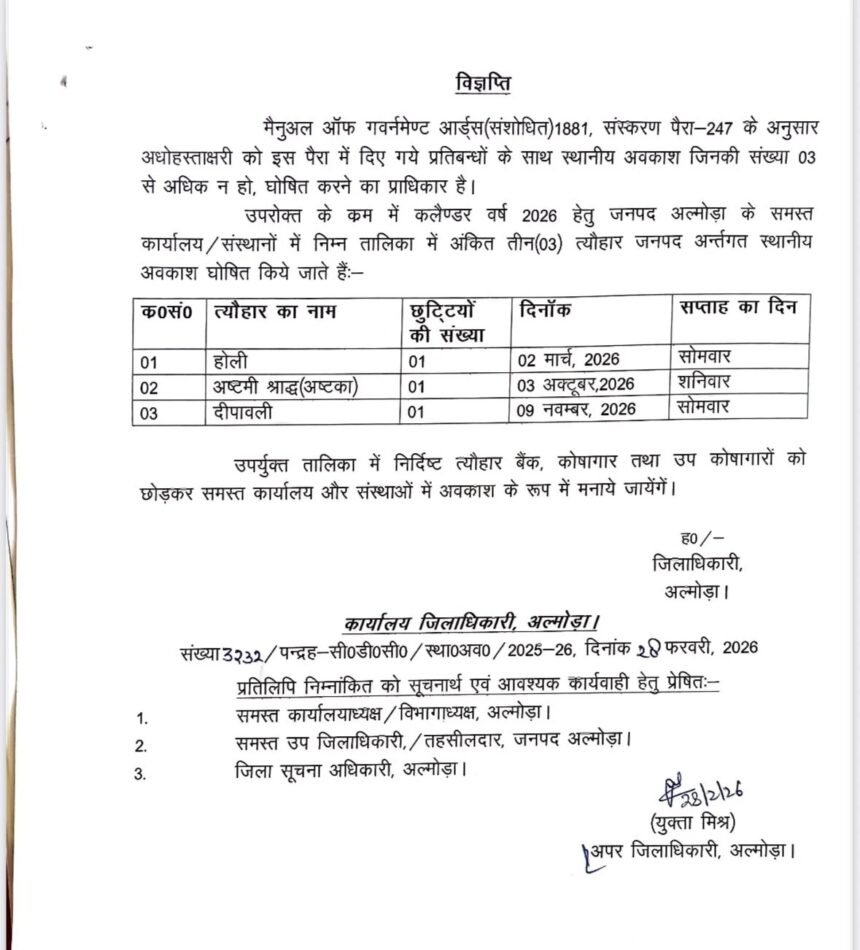 होली पर जिला प्रशासन अल्मोड़ा ne एक दिन का अतिरिक्त अवकाश घोषित किया है। अपर जिलाधिकारी अल्मोड़ा की ओर से जारी आदेश में अपना विशेषाधिकार प्रयोग करते हुए सोमवार 2 मार्च 2026 को होली के लिए अतिरक्त अवकाश की घोषणा की है। आदेश में कहा गया है कि मैनुअल ऑफ गवर्नमेण्ट आर्ट्स (संशोधित) 1881, संस्करण पैरा-247 के अनुसार अधोहस्ताक्षरी को इस पैरा में दिए गये प्रतिबन्धों के साथ स्थानीय अवकाश जिनकी संख्या 03 से अधिक न हो, घोषित करने का प्राधिकार है। पत्र में 2 मार्च को होली, 3 अक्टूबर 2026 को अष्टमी श्राद्ध, तथा 9 नवंबर 2026 को दीपावली के अवकाश की घोषणा की गयी है।